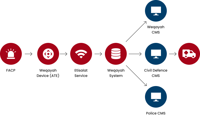 WEQAYAH program connects all fire alarm systems in commercial, industrial, and professional buildings, facilities, and warehouses in Ajman with a smart system that monitors the fire panel at all times (24/7). The system transmits all events from the control panel through wireless technology to the control command center for rapid response in the event of fire emergency.